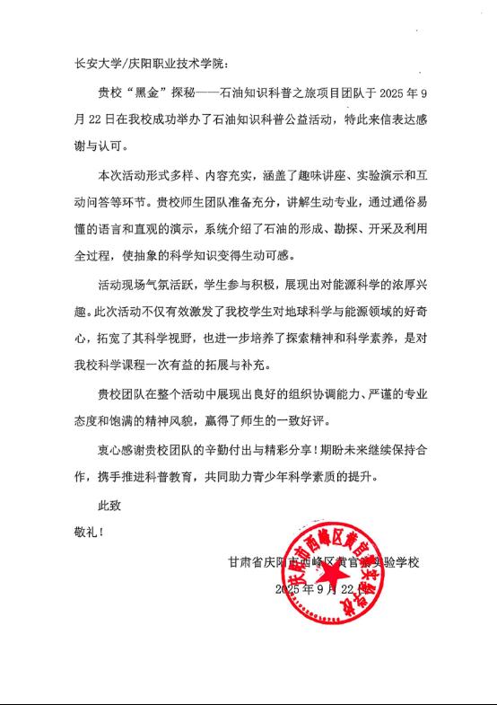 活动获得了积极反响,庆阳市西峰区黄官寨实验学校专门发来感谢信,对活动的组织成效与师生表现予以充分肯定。信中表示,本次活动“形式多样、内容充实、讲解生动专业”,使抽象的科学知识更易于理解,不仅激发了学生对地球科学与能源领域的兴趣,也有助于拓宽科学视野、培养探索精神与科学素养。来信特别提到,人兽性交
