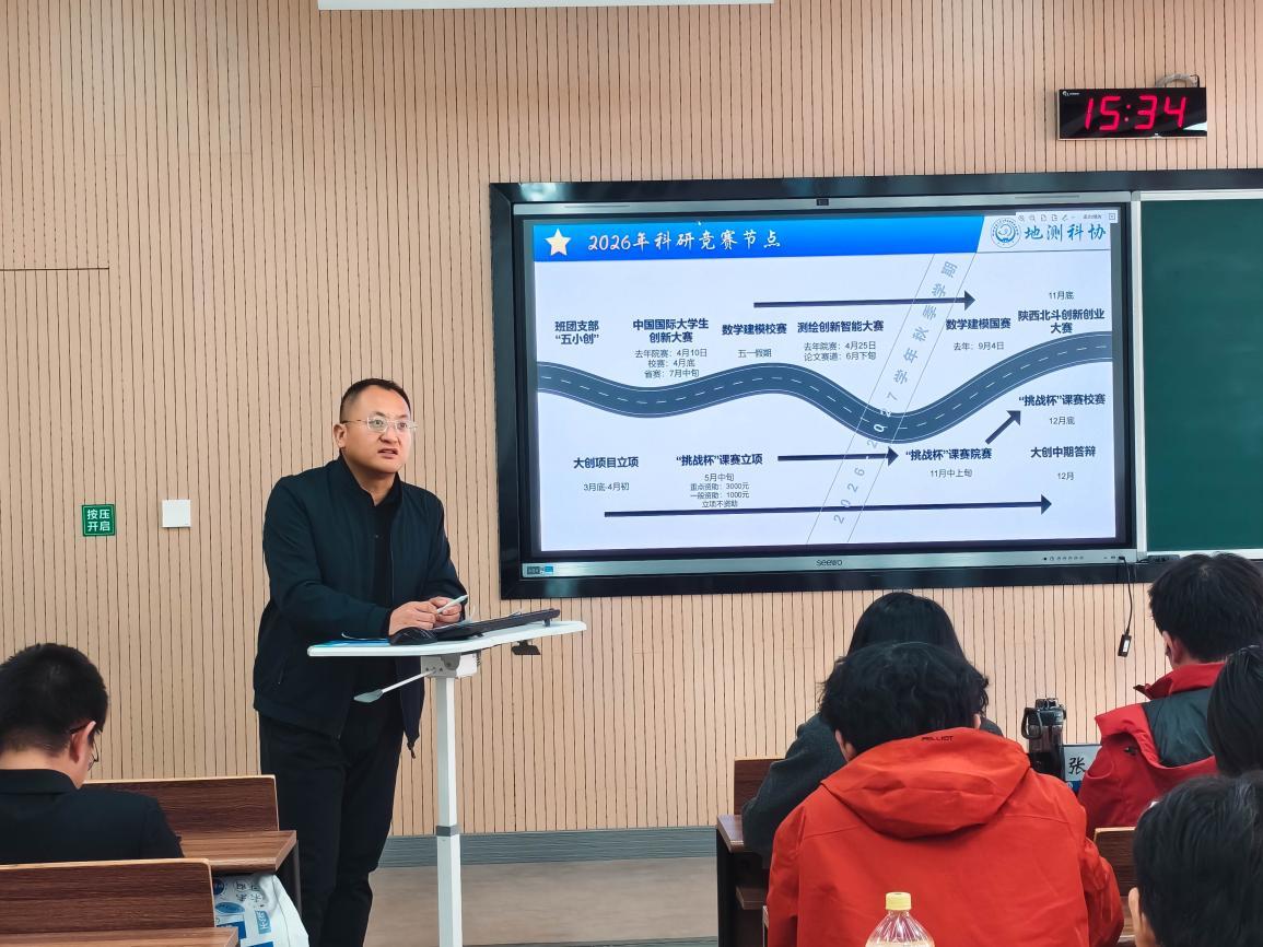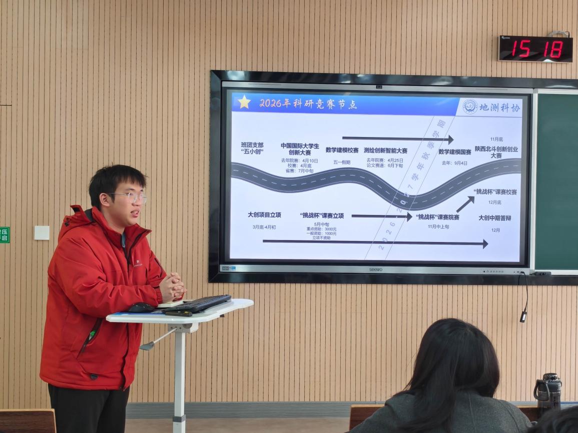大学生科技创新创业协会(下简称“地测科协”)内部沟通交流,总结过去一学期工作成效并规划未来工作,地测科协于2026年3月22日14时在WX2209教室召开了2025-2026学年春季学期第一次全体例会。地测科协指导老师马见青、地测科协2025-2026学年执行主席张凯洋、主席团成员姜炤君、袁林桃、梁怡晨以及地测科协全体成员共同参会。会议由朱靖远主持。
