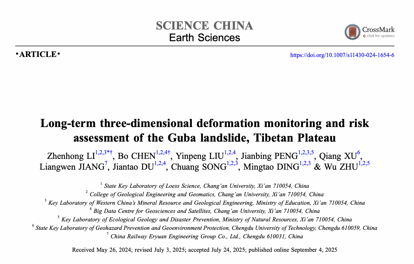 李振洪教授团队与成都理工大学许强教授、中铁二院蒋良文副总工程师合作,在人迹罕至高位远程滑坡长时序三维监测和风险评估方面取得新进展。相关研究成果以“青藏高原古巴滑坡长时序三维形变监测和风险评估”为题,于2025年9月3日发表于《中国科学:地球科学》(Science China Earth Sciences)杂志,通讯作者为人兽性交